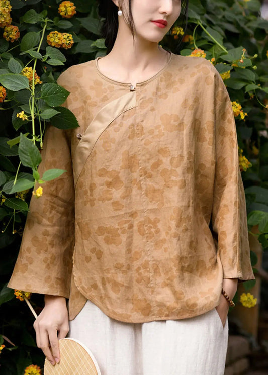 Yellow Button Print Linen Blouses O Neck Long Sleeve CG1045