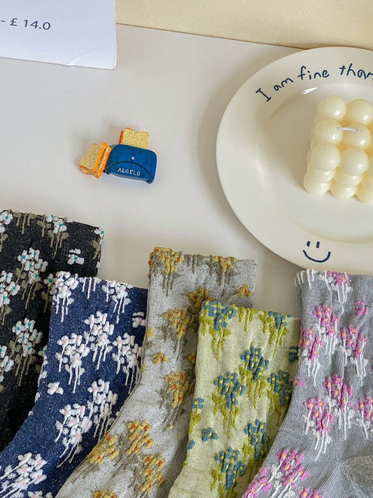 5 Pairs Women Autumn Artsy Flower JAcquard Cotton Socks QM009
