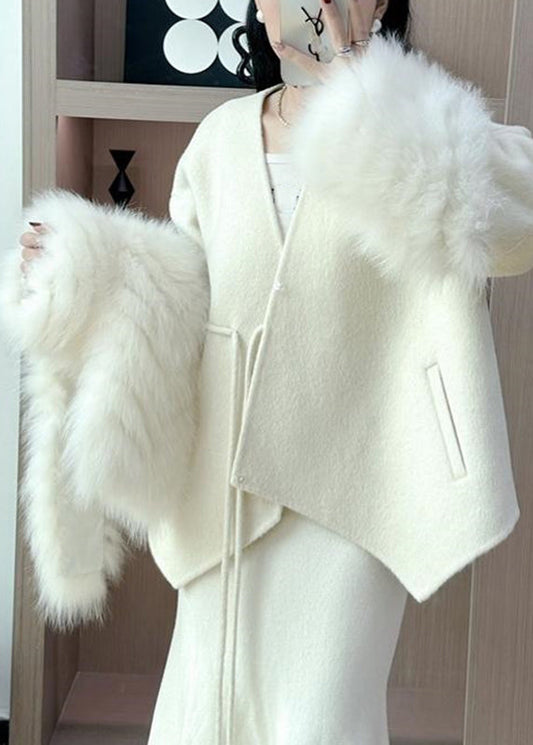 Elegant Caramel Fox Collar Patchwork Tie Waist Woolen Coats Fall RY016