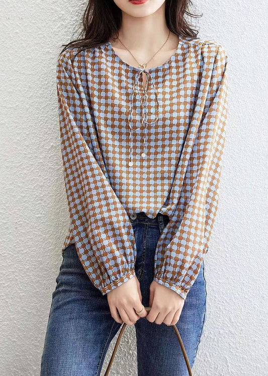 Elegant Coffee Print Lace Up Cotton Blouses Long Sleeve RE015