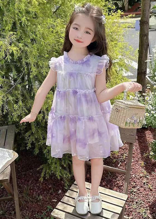 Elegant Purple Ruffled Print Chiffon Girls Dresses Summer TT045