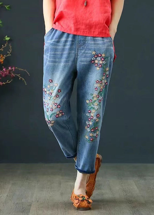 Embroidered Flared Vintage Trousers Denim Spring Blue Pockets