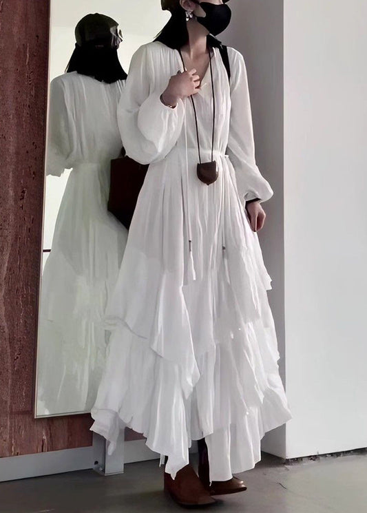 Fall Solid Cotton Wrinkled Long Neck Black Dress French V