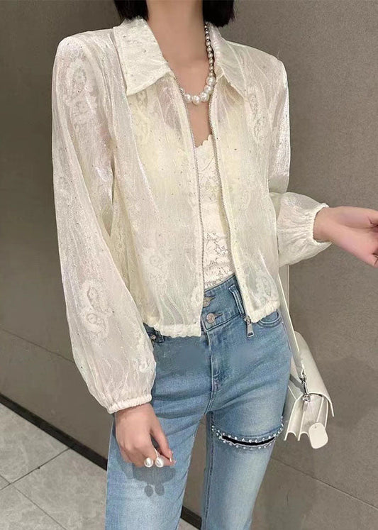Fine Black Peter Pan Collar Zircon Zippered UPF 50+ Coat Long Sleeve VB1051