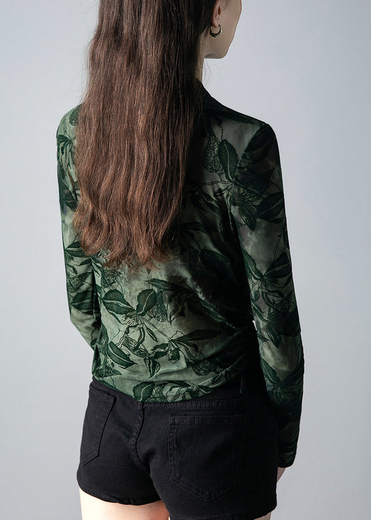 Fine Green Hign Neck Print Slim Fit Tulle Shirt Fall AL1075