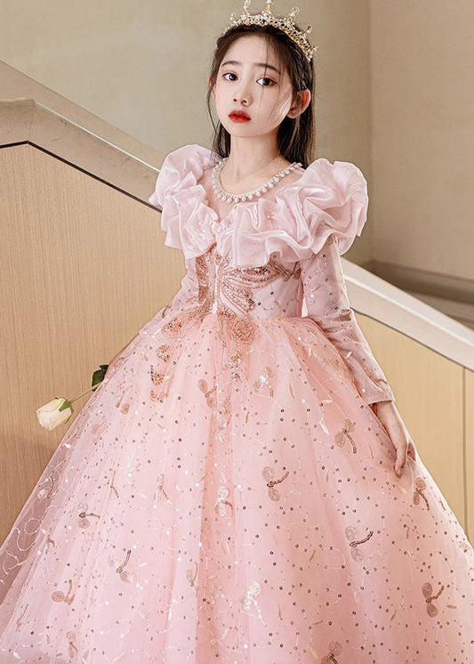 Fine Pink Embroideried Patchwork Tulle Kids Maxi Dress Fall RP037