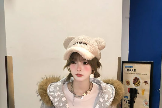 Fluffy Hooded Lettering Embroidered Zip Jacket