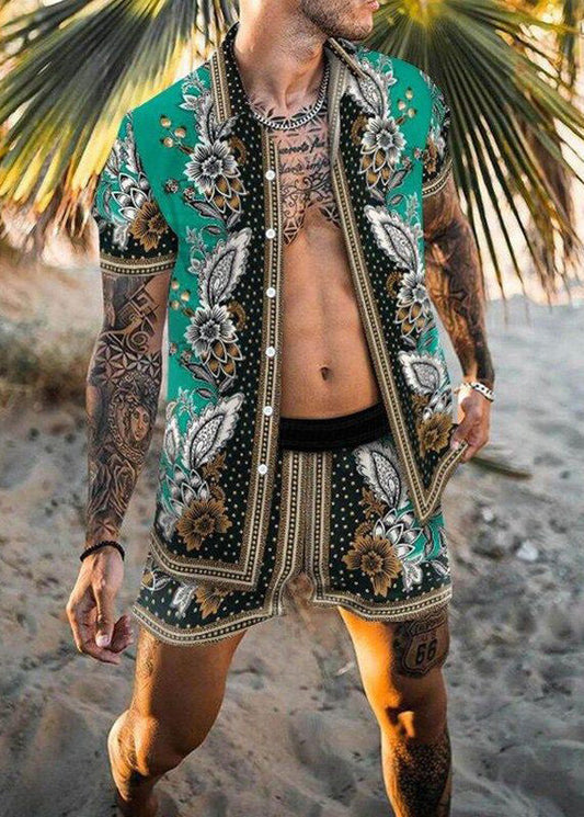 French Blue Peter Pan Collar Print Cotton Men Two Pieces Set Summer HG038
