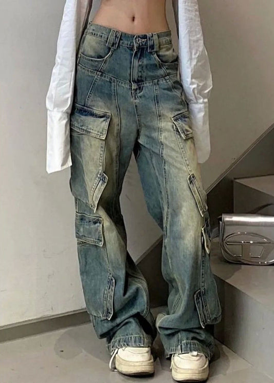 French Blue Pockets Elastic Waist Denim Pants Fall QF041