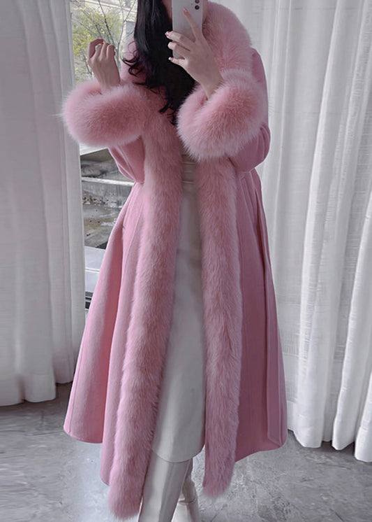 French Green Fox Collar Pockets Patchwork Tie Waist Maxi Woolen Coat Winter RD002