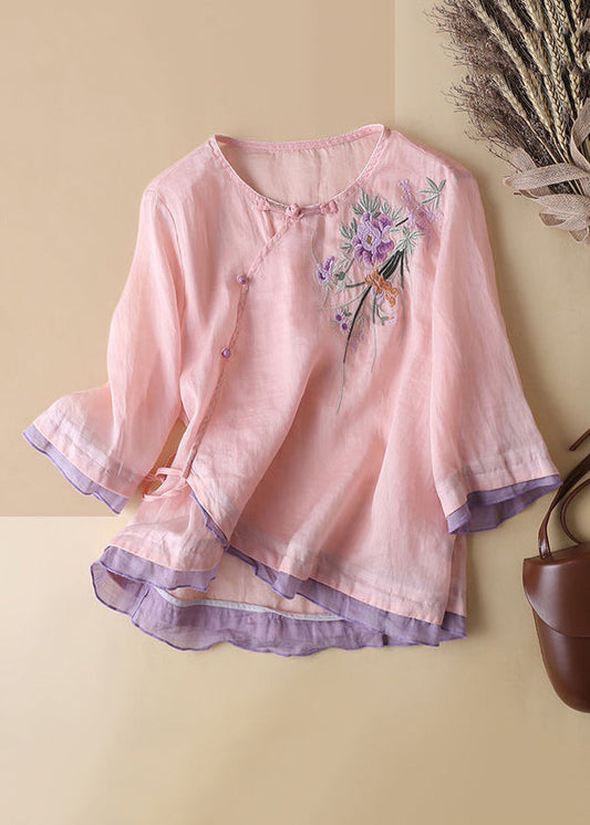 French Linen Embroidered Button Cotton Blouses Half Sleeve JH023