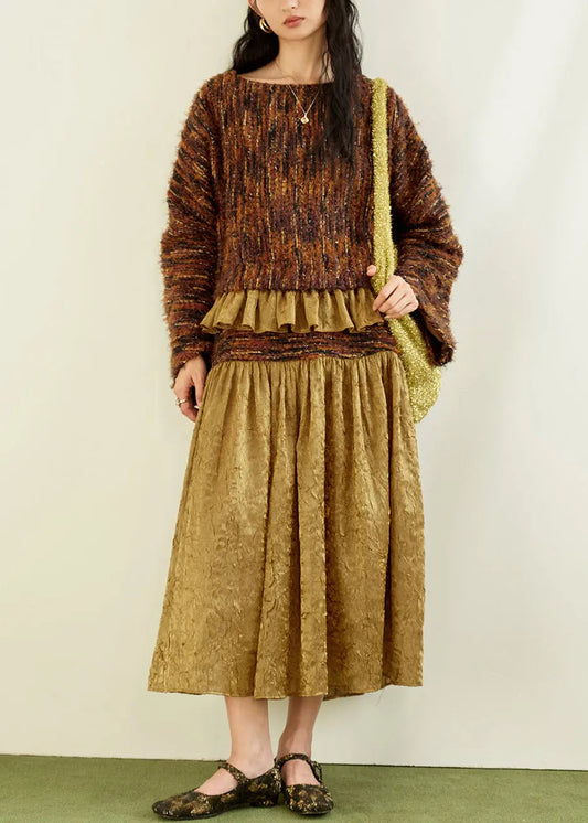 French Peter Pan Collar Print Patchwork Cotton Knit Cardigans And Maxi Skirts Two Pieces Set Fall WV023