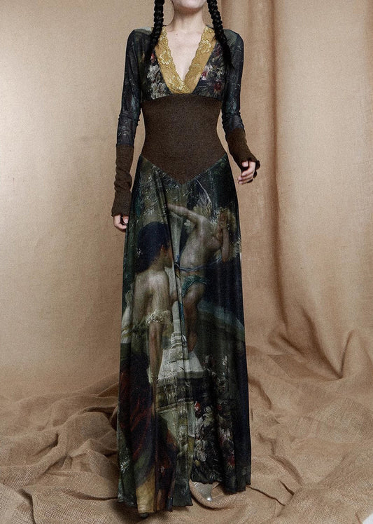 French Photo Color V Neck Print Patchwork Cotton Dress Long Sleeve KK090