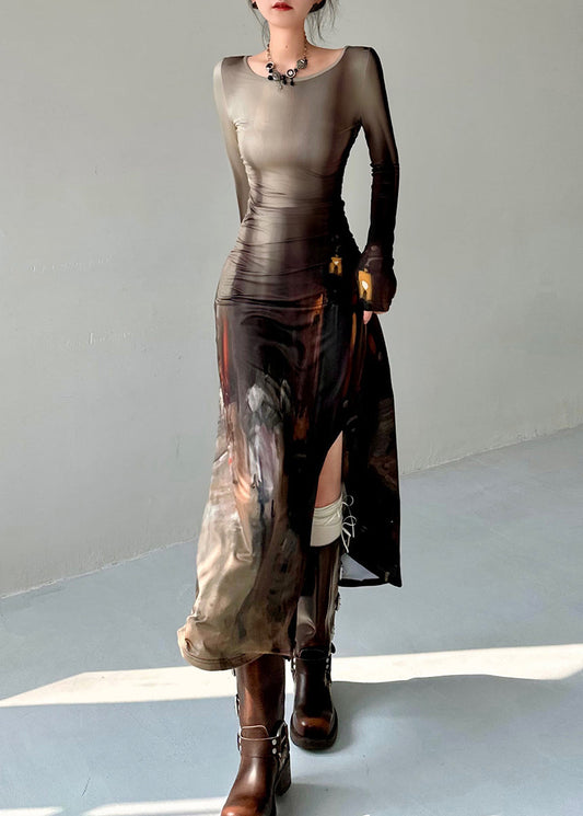 French Retro Oil Painting Printed Side Open Dress Autumn AN1012