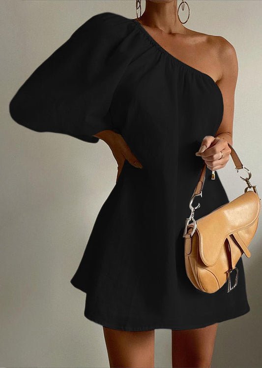 French White Asymmetrical Solid Cotton Mid Dress Bracelet Sleeve QE044