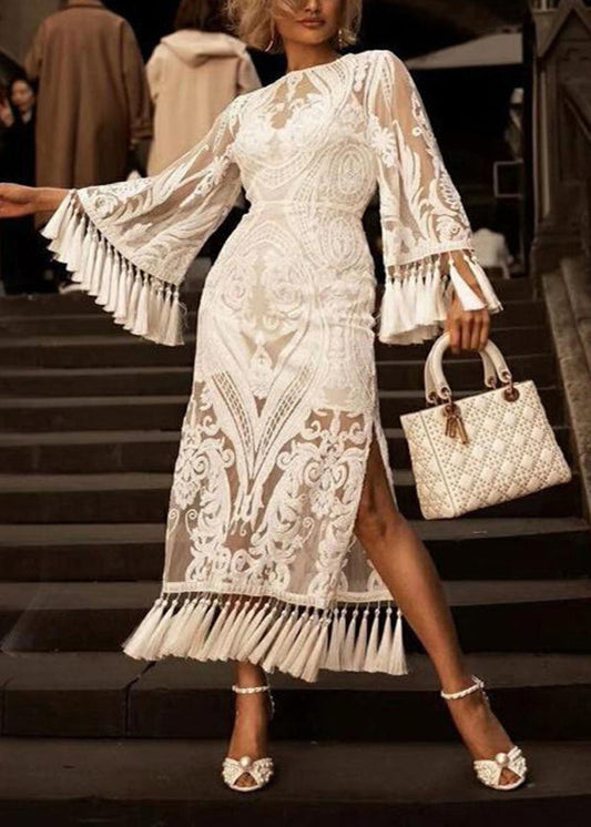 French White Embroidered Tasseled Lace Dress Two Pieces Set Fall QR015