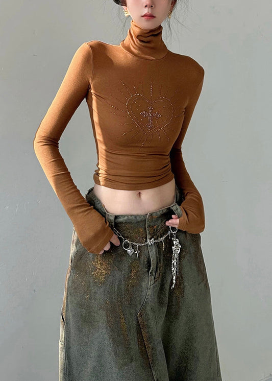 French White Hign Neck Zircon Cotton T Shirts Top Fall AL1058