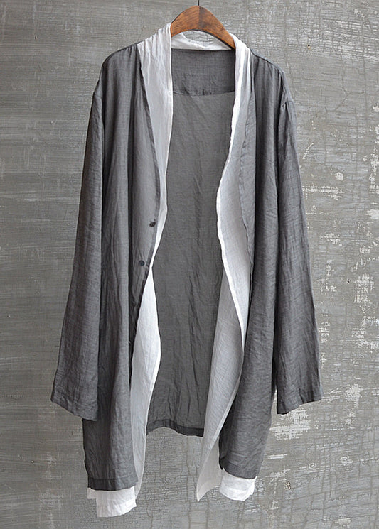 Handmade Black Patchwork Button Fake Two Pieces Linen Mens Shirts Long Sleeve TR015