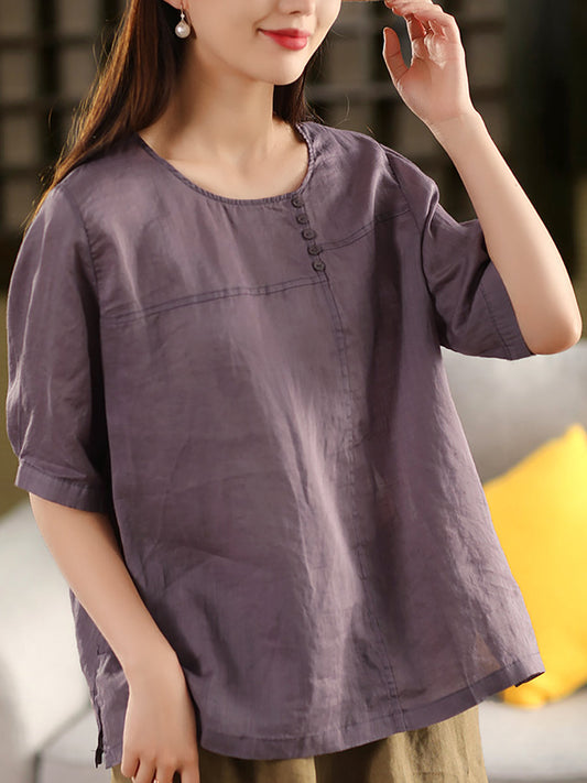 100%Ramie Pure Shirt Women Vintage O-Neck Summer Color