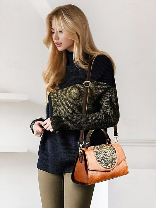 Vintage Floral Engraved Faux Leather Handbag – Women's