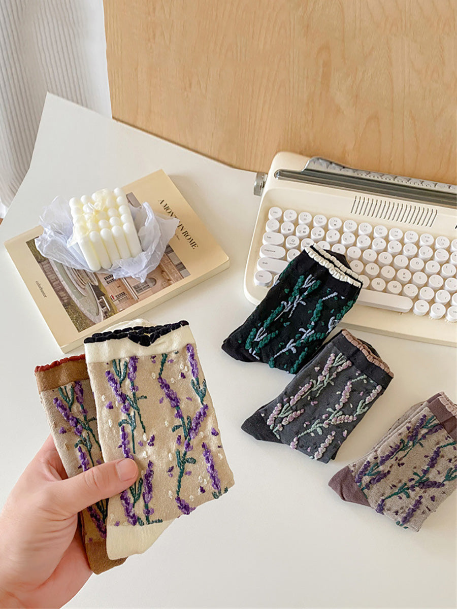 5 Pairs Women Flower Jacquard Colorblock Cotton Socks AH1024