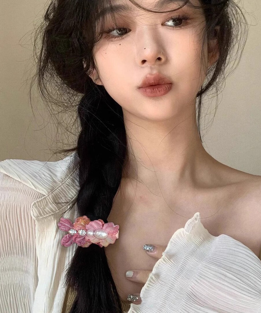 Cute Pink Crystal Pearl Tulle Floral Tassel Drop Earrings LL007