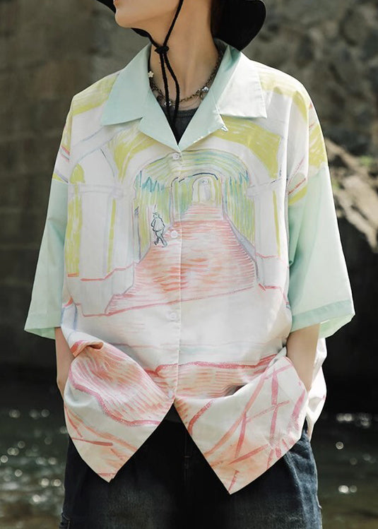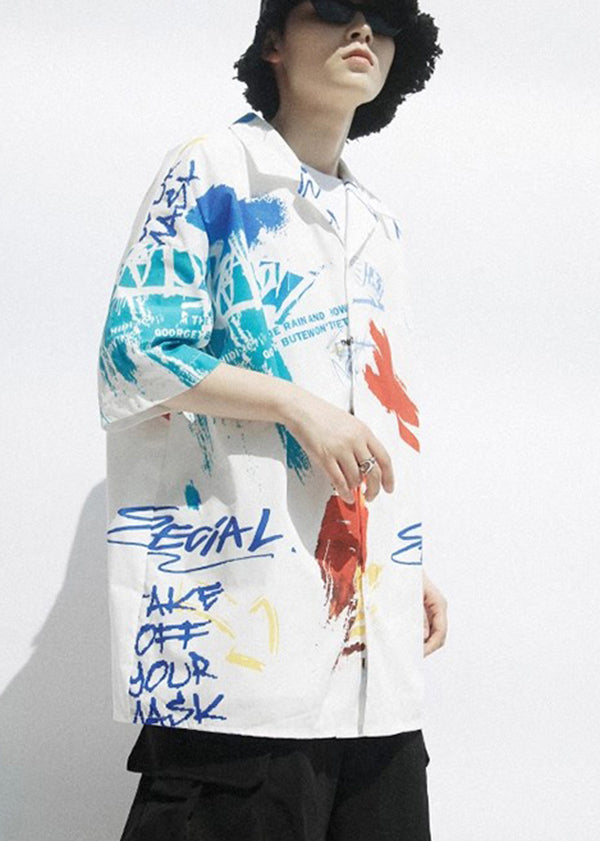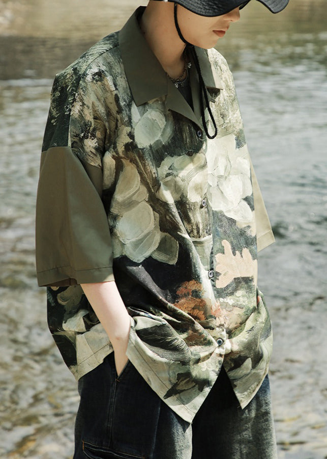 Army Green Cuban Collar Retro Floral Men's Shirt Short Sleeved HG014