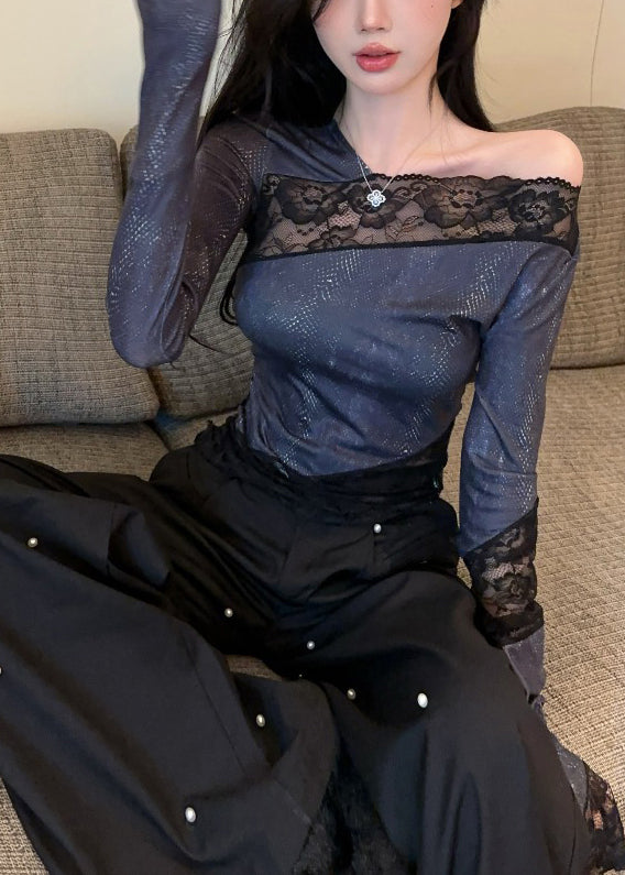 Art Navy Asymmetrical Patchwork Cold Shoulder Top Spring YP013