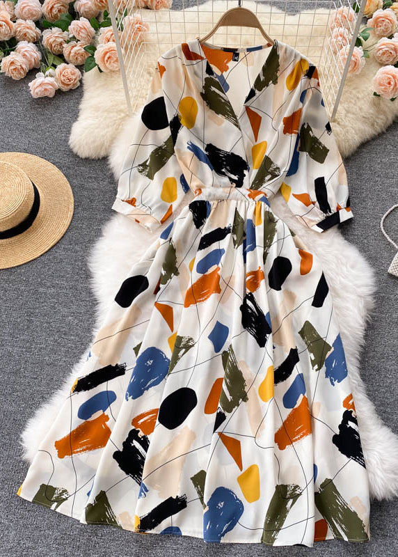 Beautiful Black V Neck Print Chiffon Dresses Half Sleeve TR040