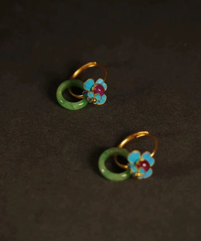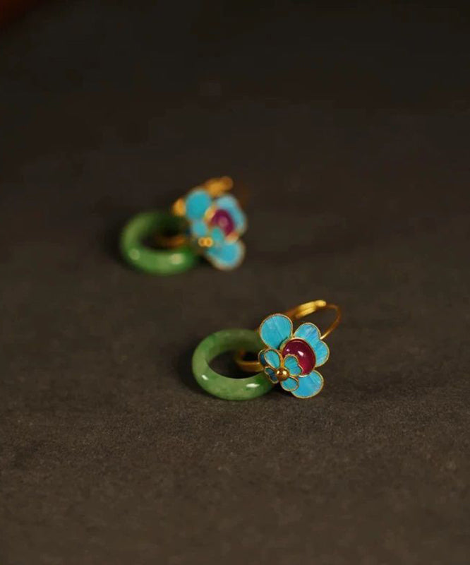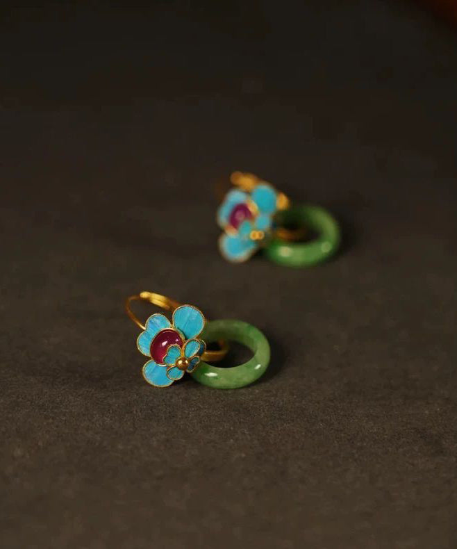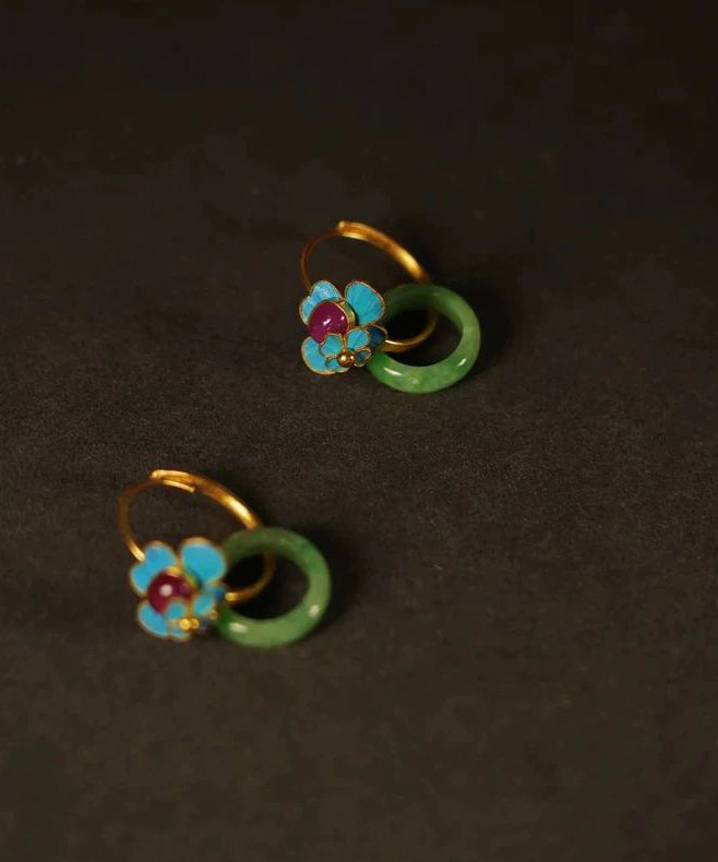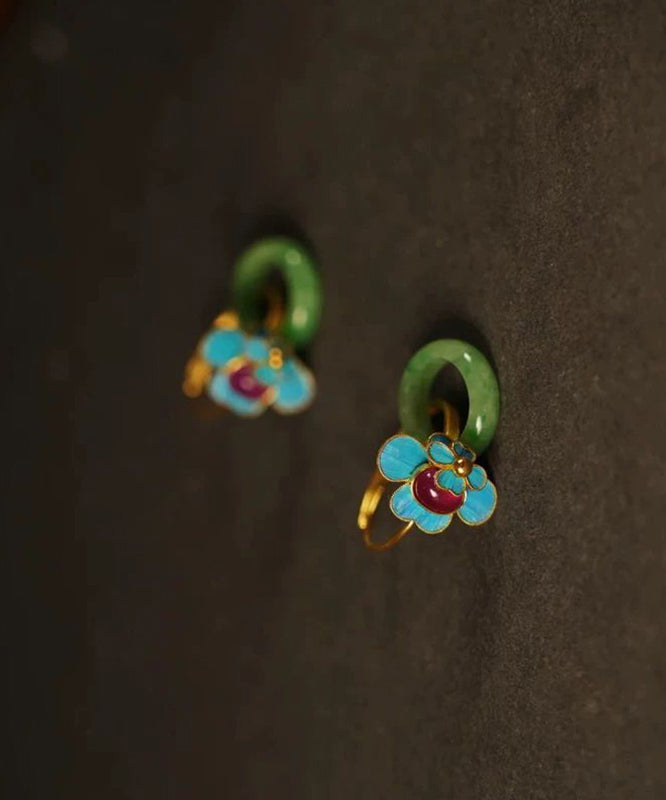 Beautiful Green Sterling Silver Overgild Jade Enamel Ping Buckle Hoop Earrings