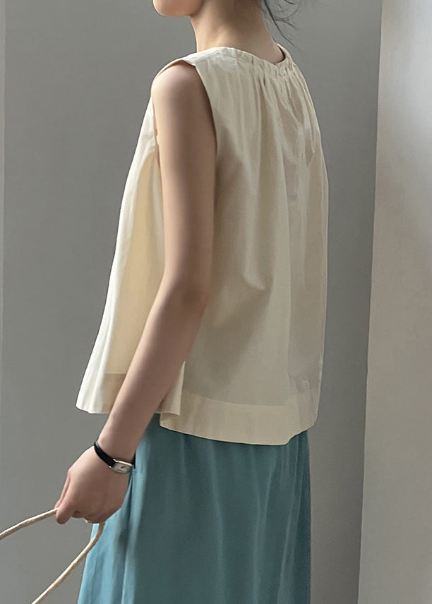 Beige Button Solid Cotton Tops O-Neck Summer QE035