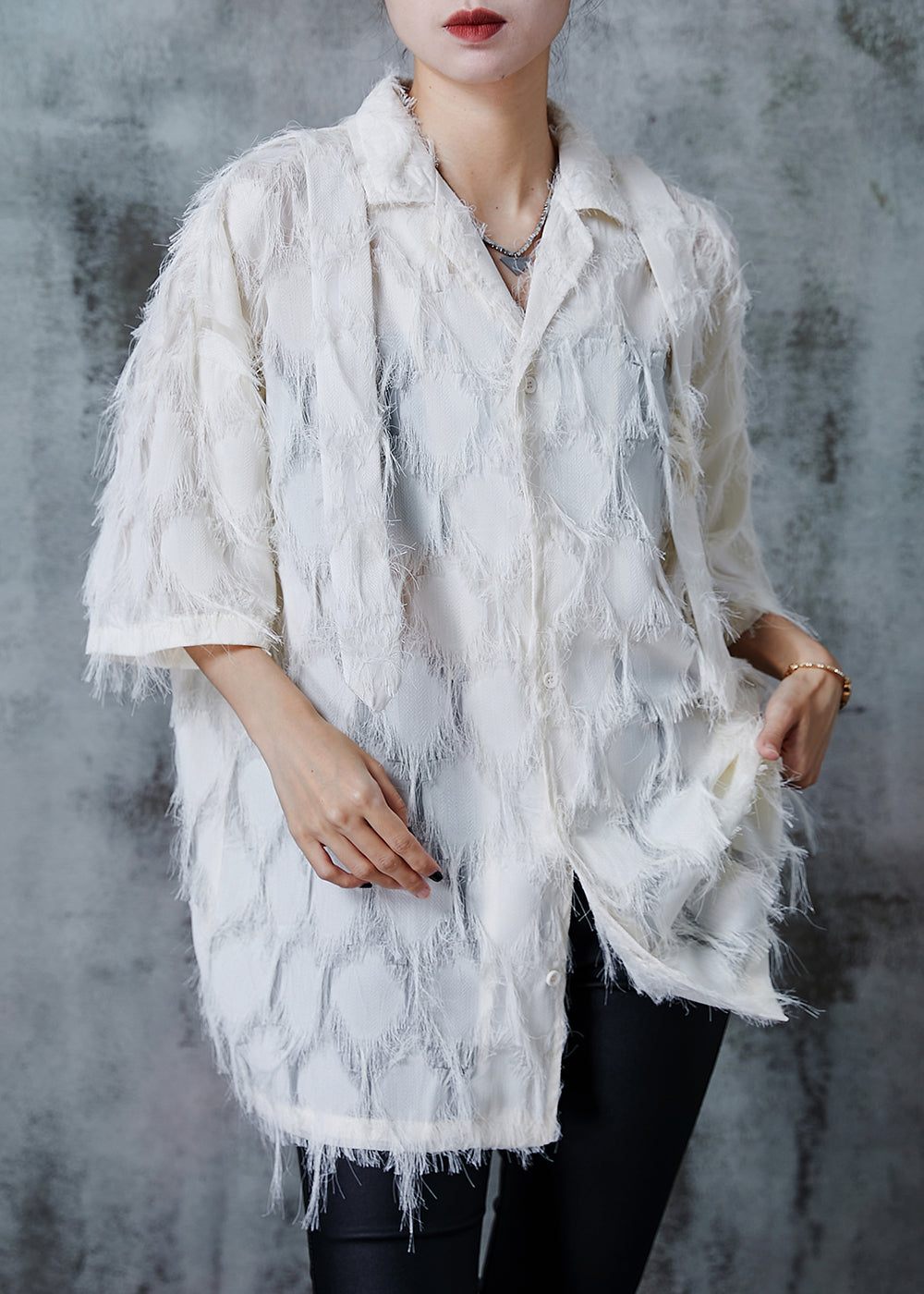 Beige Loose Cotton Shirts Tasseled Summer QA1015