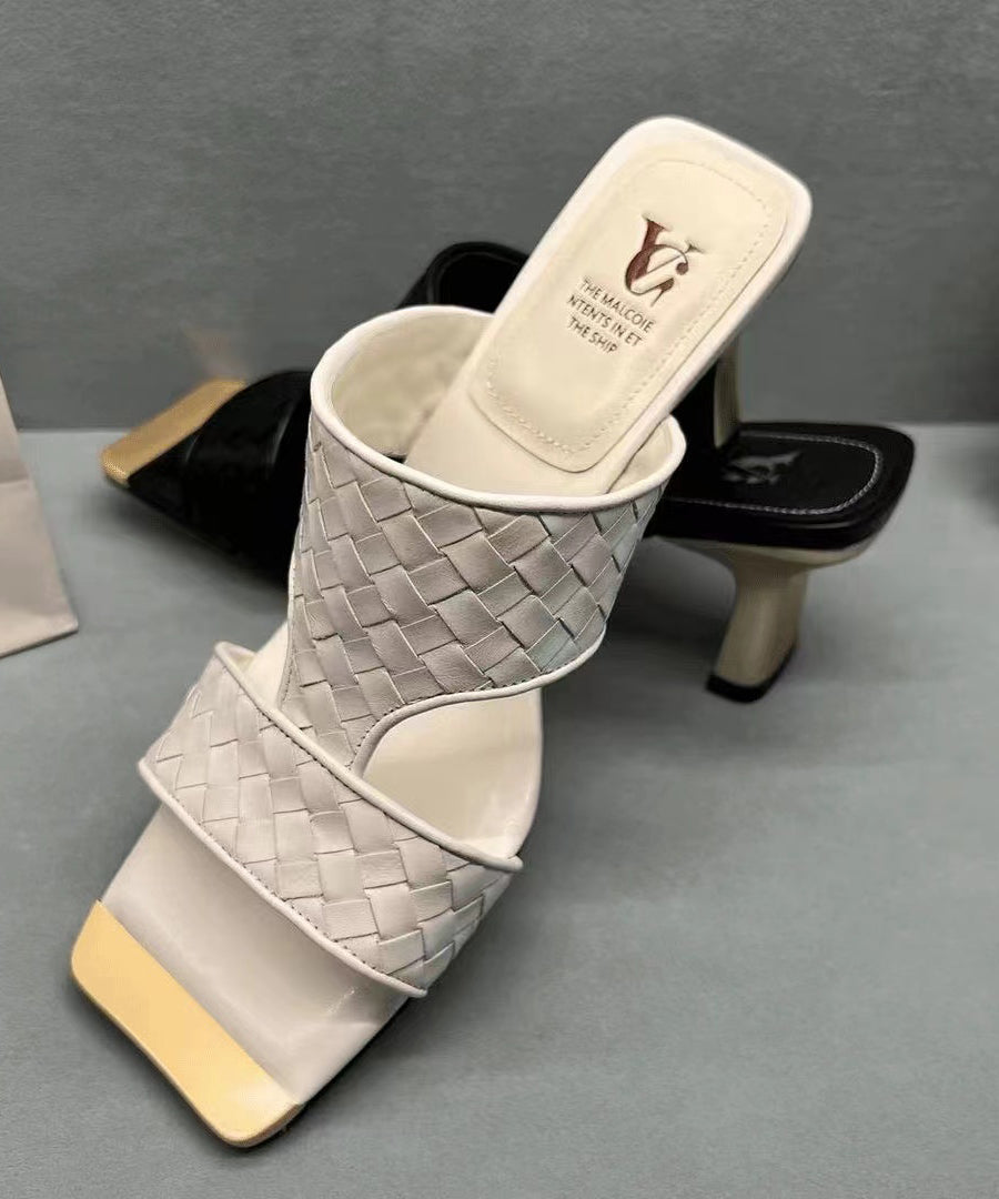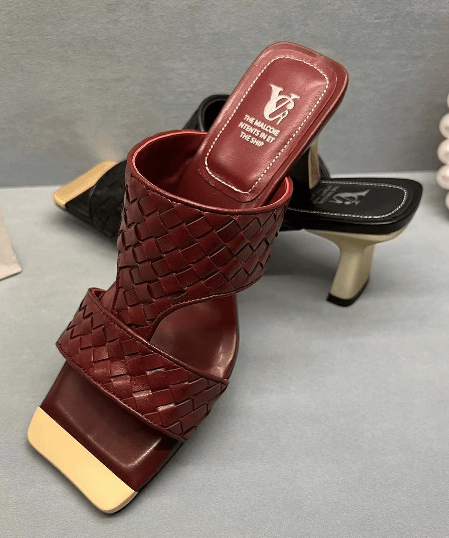 Black Chunky Heel Faux Leather Elegant Slide Sandals Peep Toe OI078