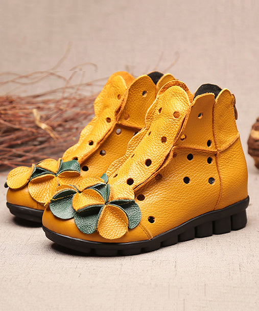 Black Hollow Out Boots Cowhide Leather Comfy Splicing Floral RD029
