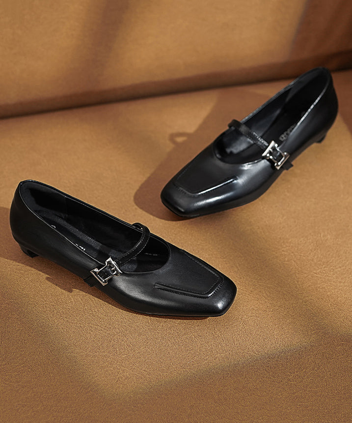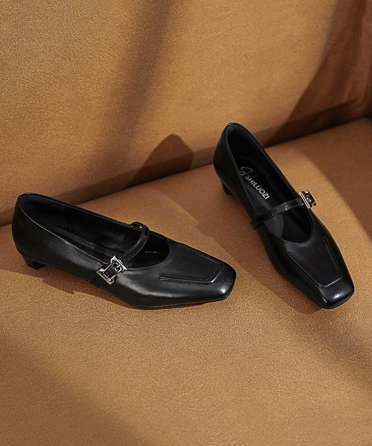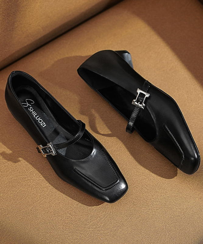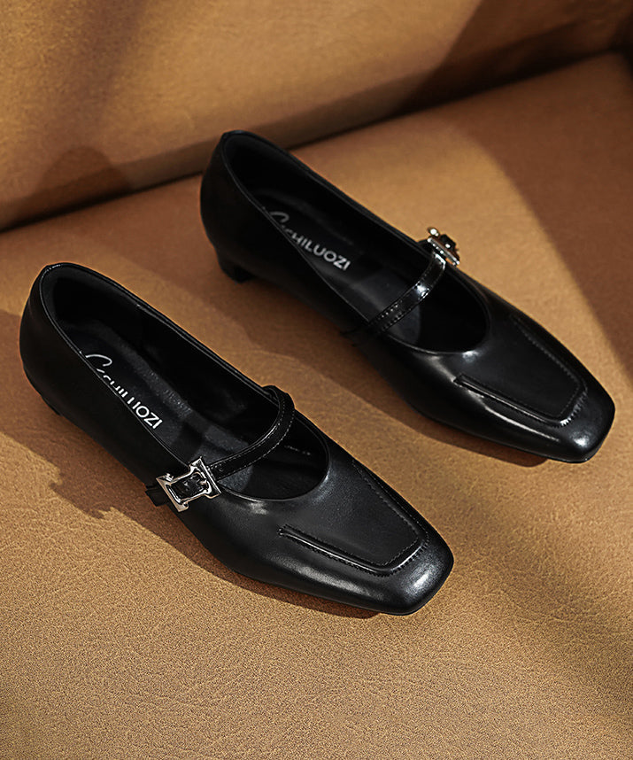 Classy Buckle Strap Splicing Chunky Black Cowhide Leather