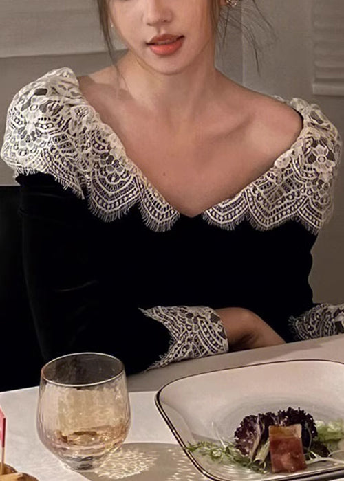 Black Patchwork V Spring Dresses Neck Silk Velvet Lace French