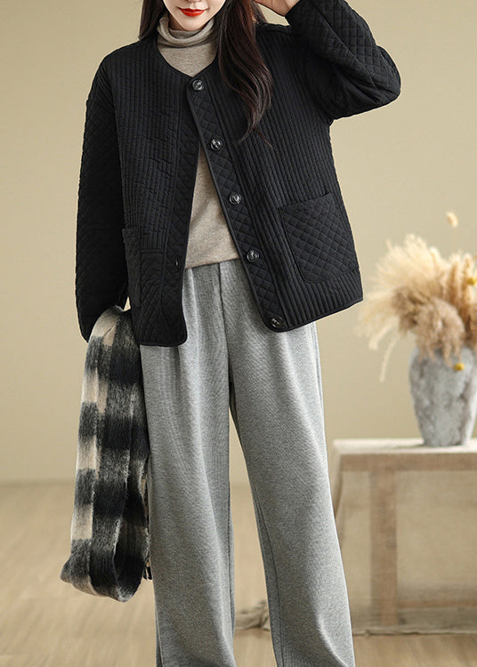 Indulge in luxury with our Black Pockets Button Fine Cotton Filled Womens Coat, perfect for spring. The O-Neck design adds a touch of sophistication while the high-quality cotton filling ensures both comfort and style.