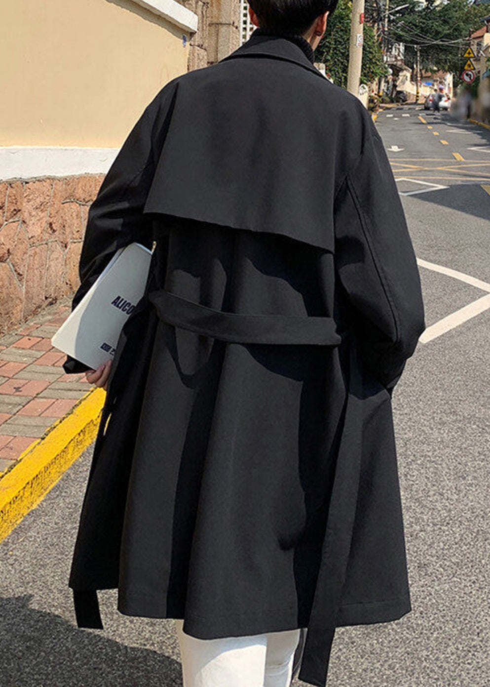 Black Tie Waist Cotton Mens Trench Coat Notched Spring YQ019