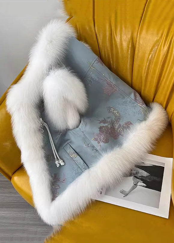 Blue Chinese Button Patchwork Cotton Filled Waistcoat Fur Collar Winter RZ032
