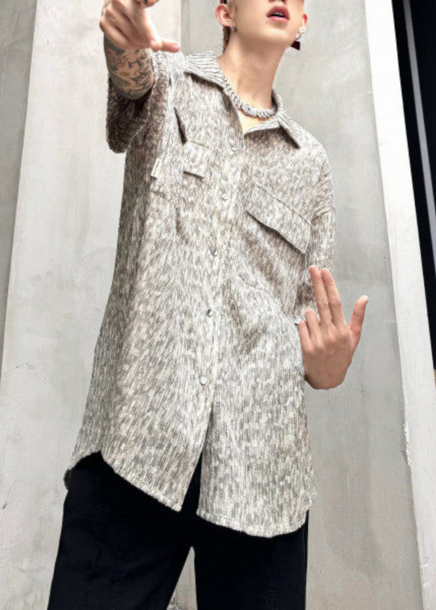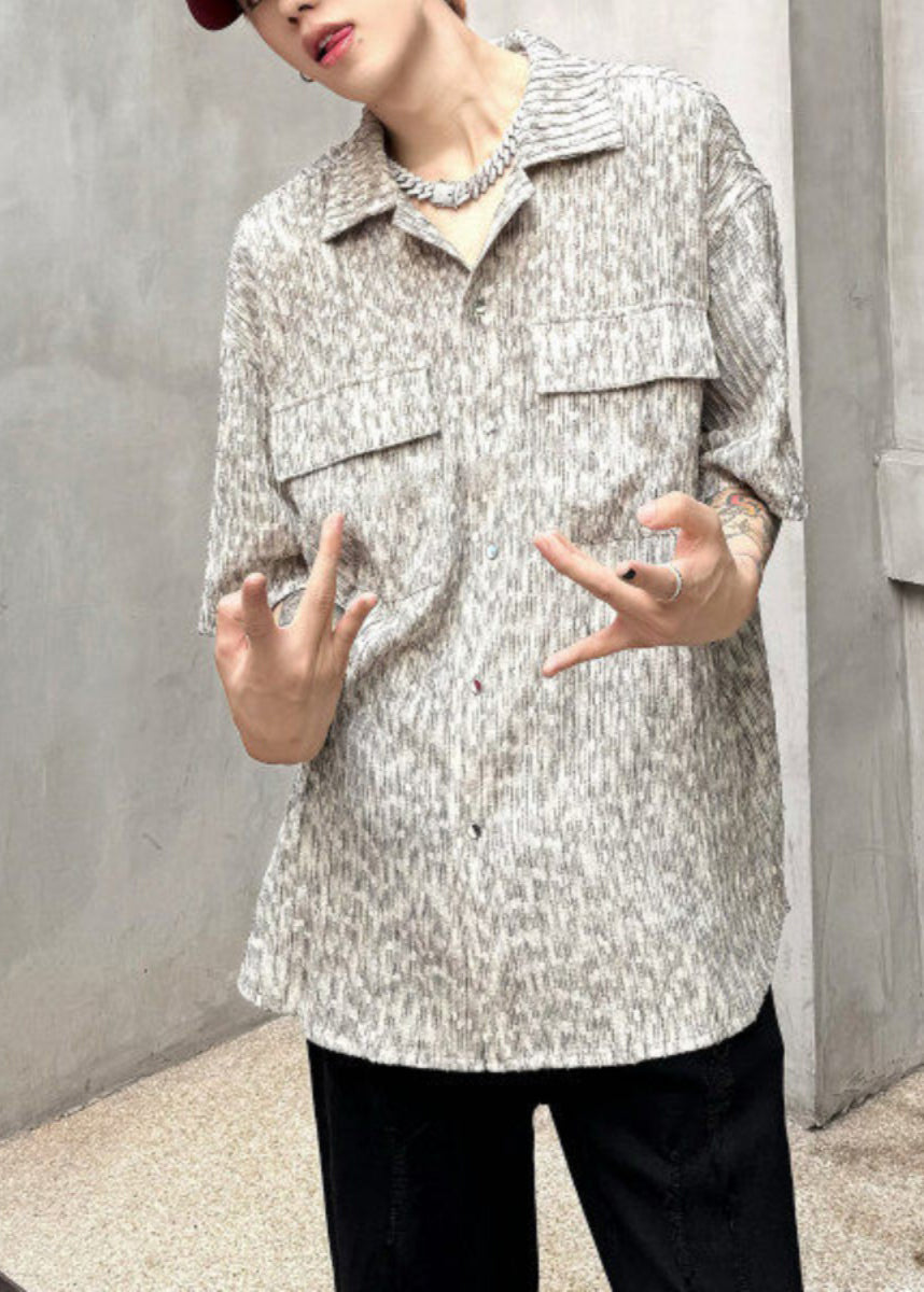 Boutique Grey Striped Button Shirts For Men Short Sleeve HG027