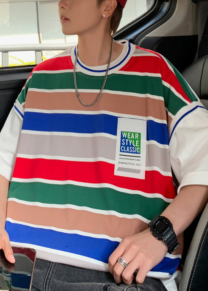 Boutique O Neck Striped False Two Pieces Cotton Men T Shirt Summer QH007