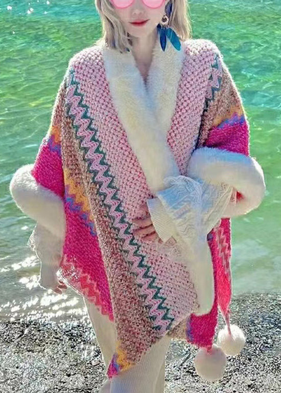 Boutique Rose Fur Collar Fuzzy Ball Patchwork Knit Shawl WP023