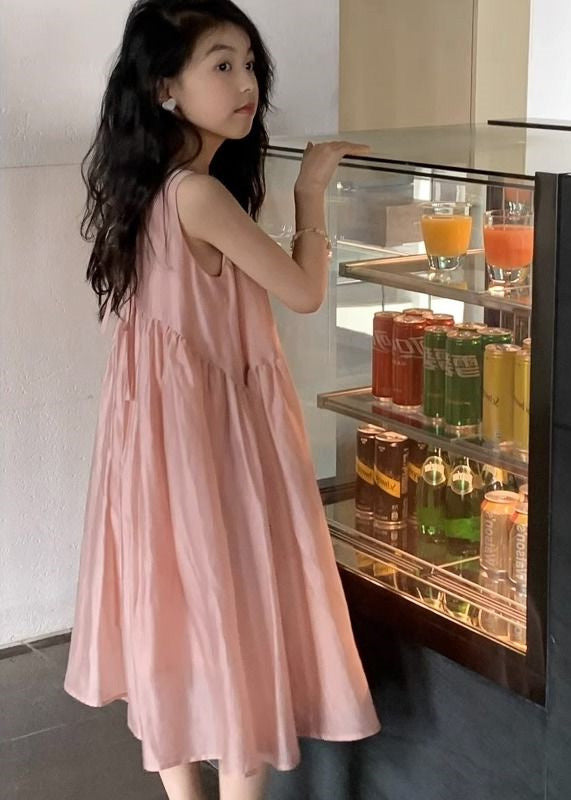 Brief Pink O-Neck Patchwork Solid Silk Kids Maxi Dresses Summer GF009