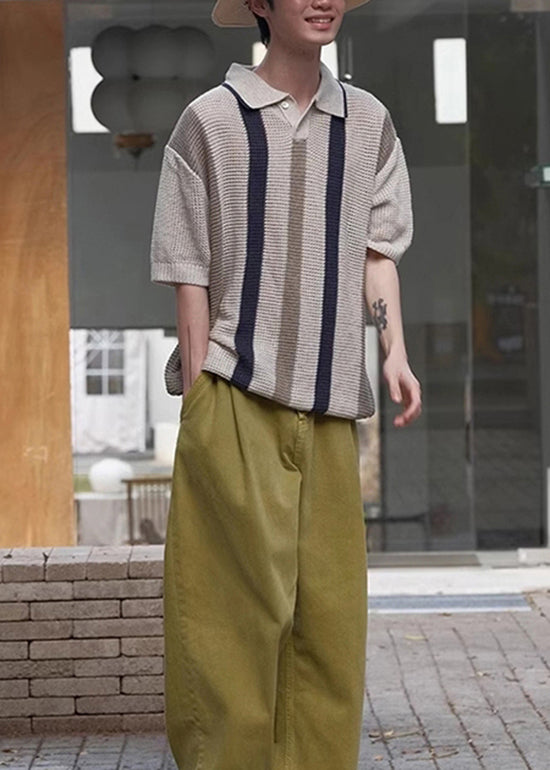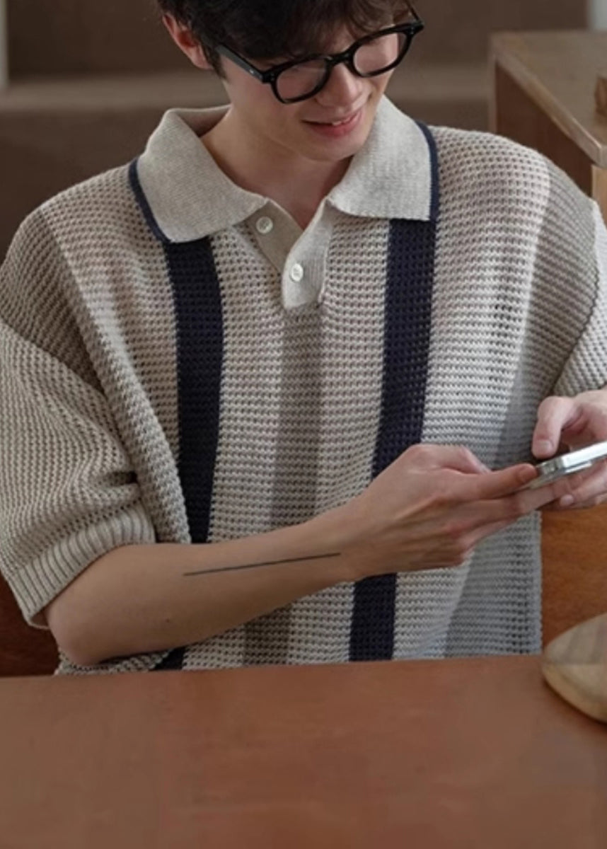 Casual Apricot Striped Hollow Out Knit Mens Polo Shirt Designer Summer QH006