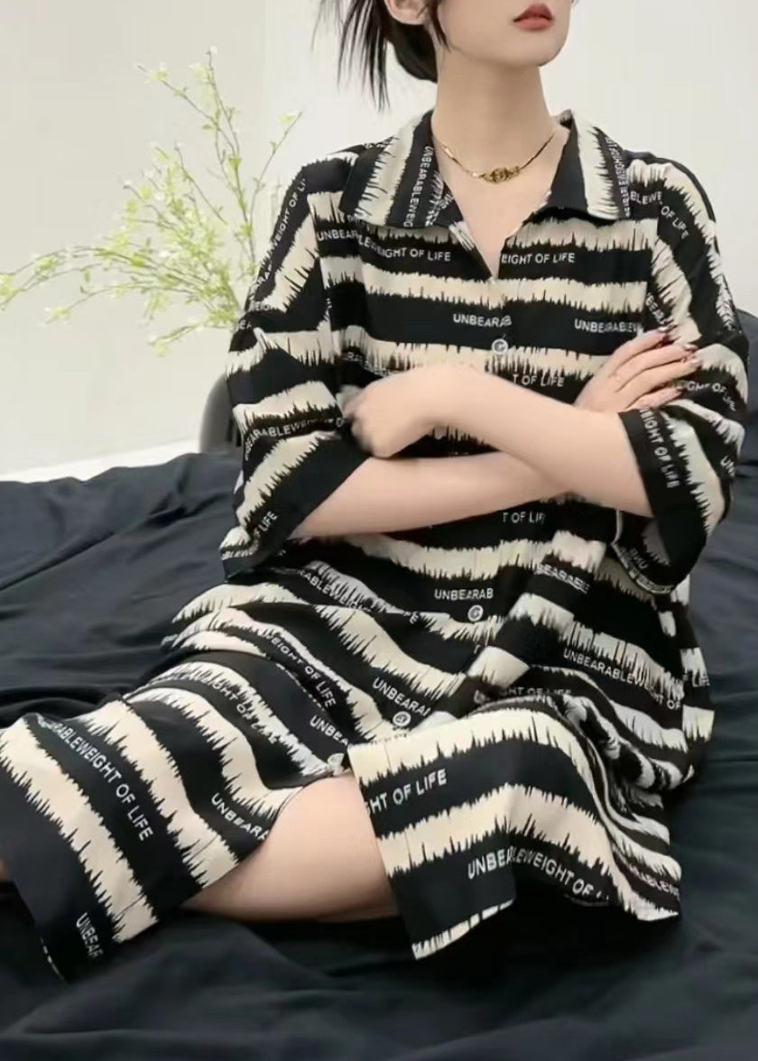 Casual Black Striped Peter Pan Collar Ice Silk Mid Dress Short Sleeve UU1020