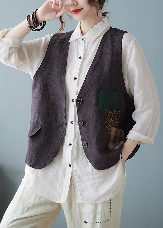 Casual Coffee V Neck Pockets Button Cotton Vest Tops Sleeveless OO010