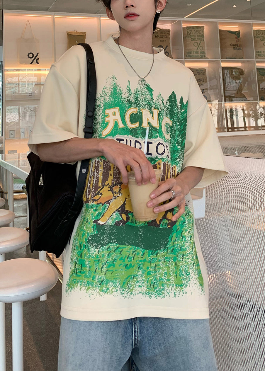 Casual Half Print Black Men's Cotton Shirts O-Neck T Sleeve