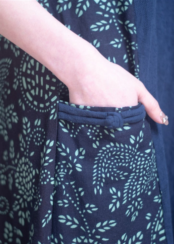 Casual Navy O-Neck Print Patchwork Side Open Robe Dresses Short Sleeve GH1066