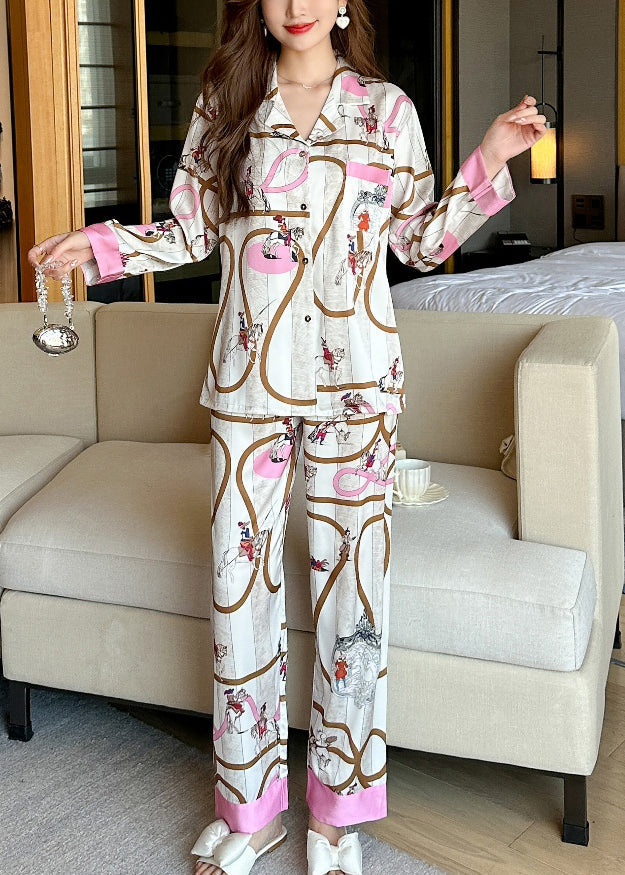 Casual Peter Pan Collar Print Button Silk Two Pieces Set Spring XS1030