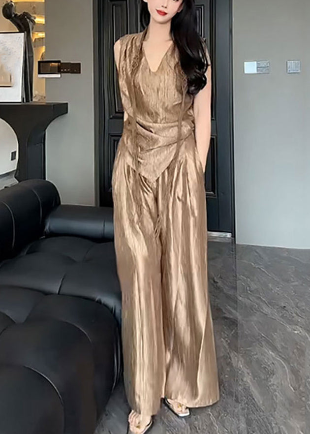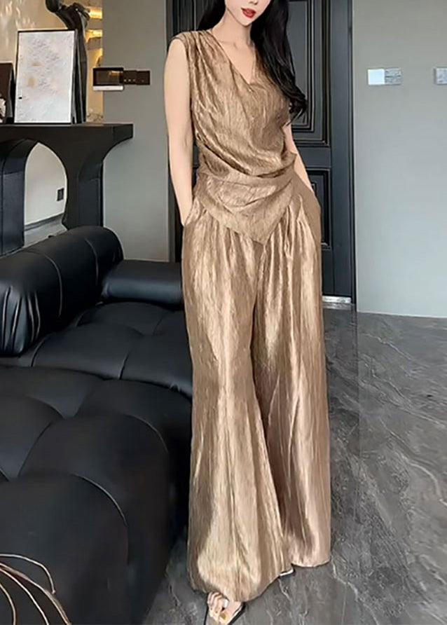 Elevate your summer style with this luxurious two piece set. Crafted from soft silk, the v-neck top and asymmetrical pants offer effortless elegance. Perfect for a casual outing or a special occasion, this set is a must-have for your wardrobe. Embrace sophistication and comfort with this stunning ensemble.